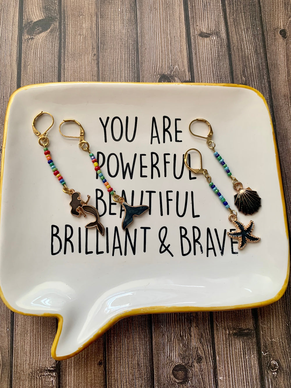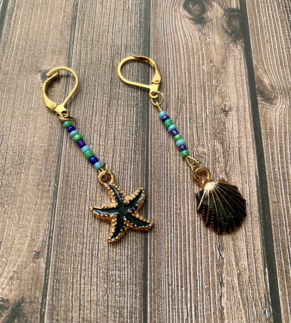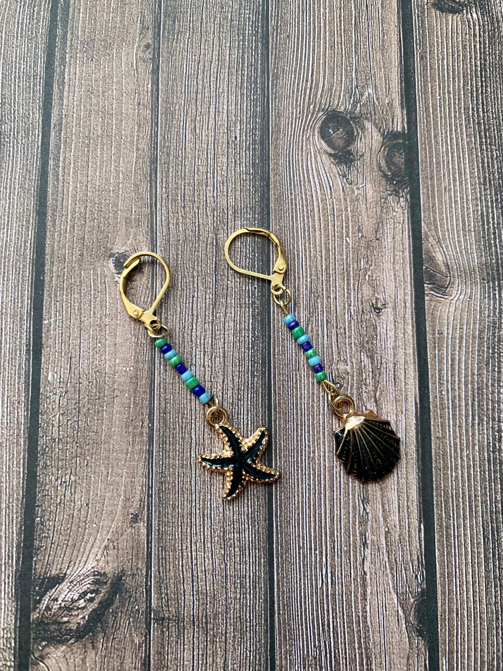 These super cute beach life dangle earrings are made with gold plated leverback ear wires with high quality pearlized seed beads and enamel charms.