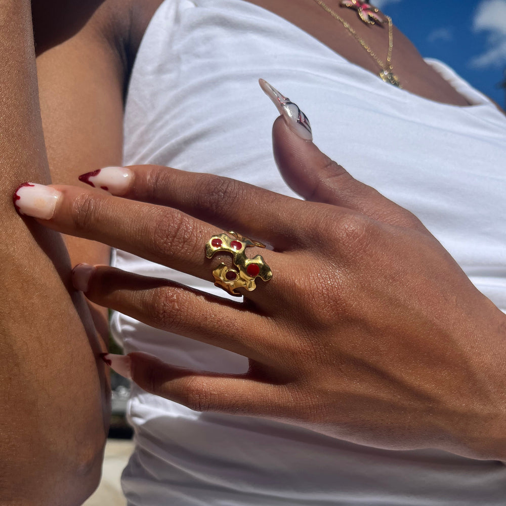 Introducing an exquisite piece from our Coastal Charm Collection: a sculptural garnet ring crafted from 18K PVD gold-plated stainless steel. This adjustable design accommodates various finger sizes while maintaining its refined aesthetic.