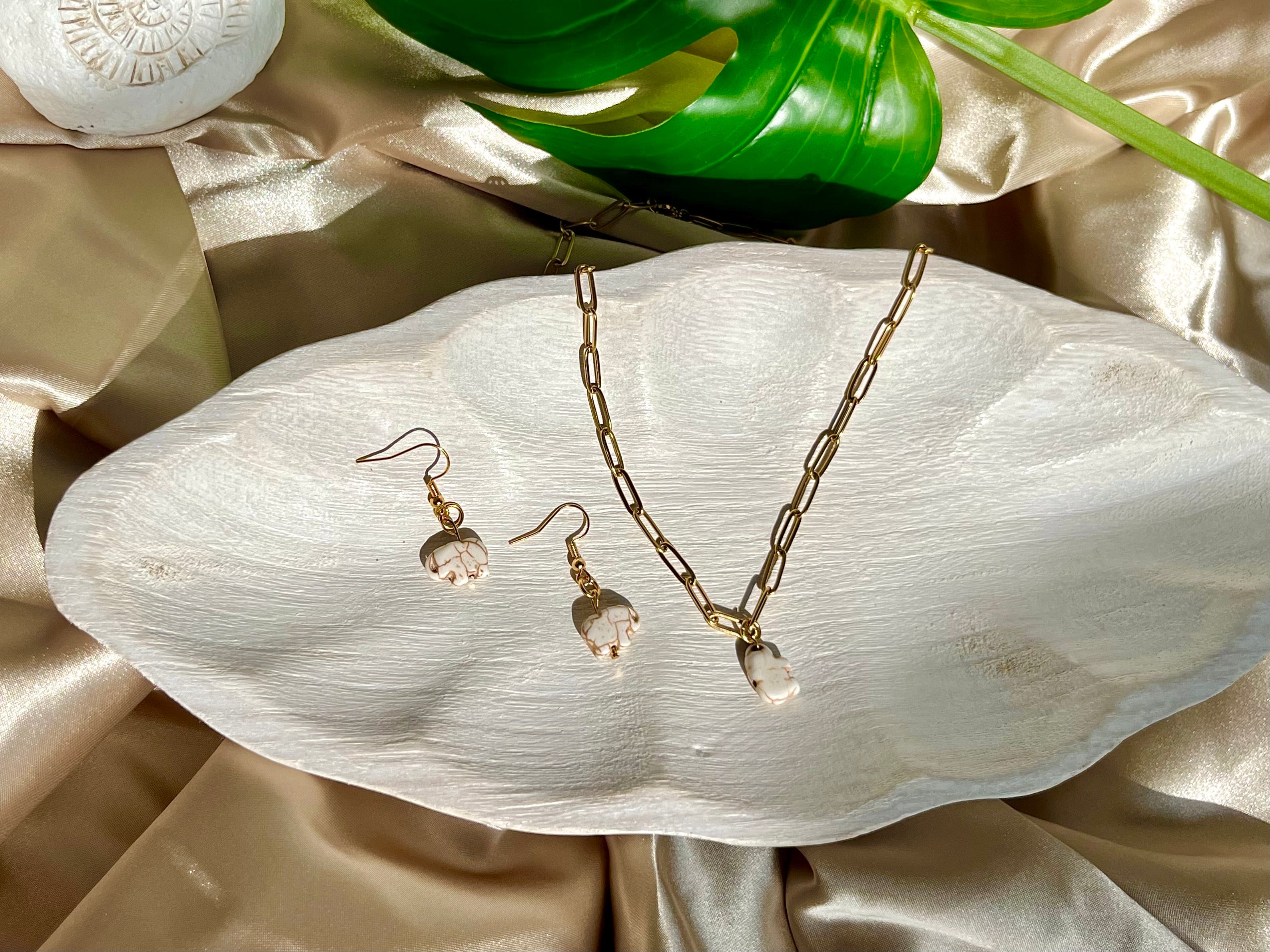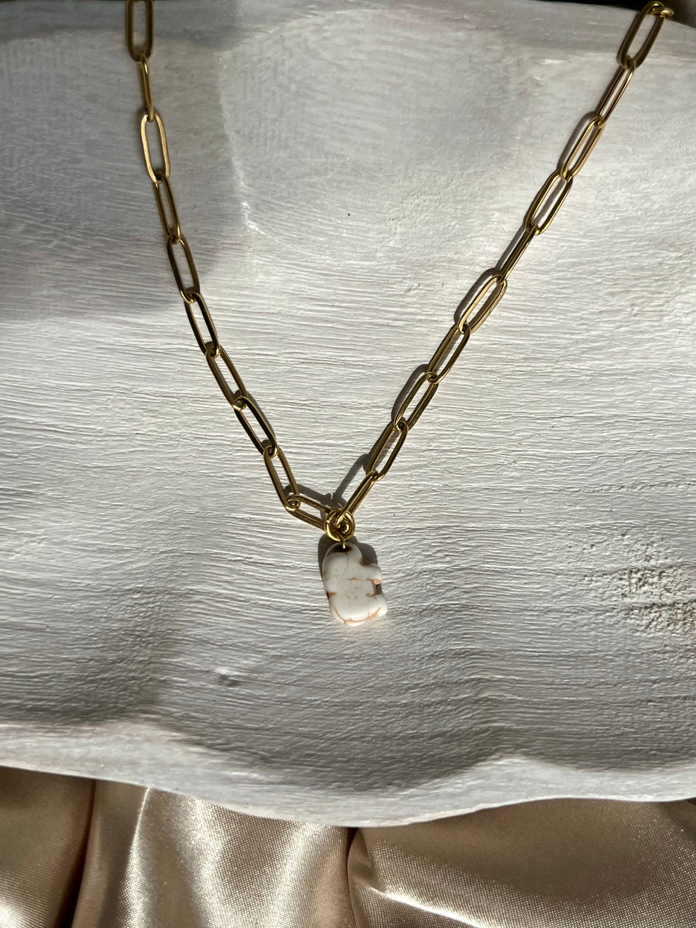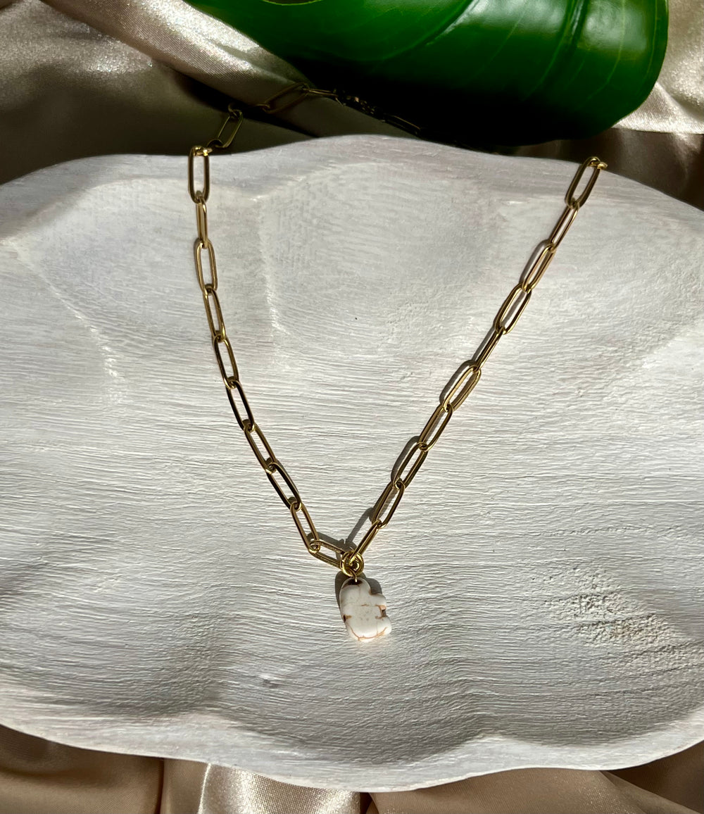 Minimalist with boho charm! This cute necklace is made with 18k gold over stainless steel paper clip chain and a white howlite stone elephant.